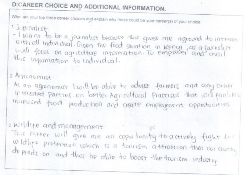Kevin hat die Schule erfolgreich abgeschlossen und die kenianische Matura bestanden. Leider reichten seine Leistungen nicht für ein staatliches Stipendium an einer Universität. Aiducation hat im Moment keinen Kontakt mit ihm. Es ist uns daher unbekannt, was er aktuell macht und ob er nach Abschluss der Mittelschule eine weitere Ausbildung beginnen konnte.