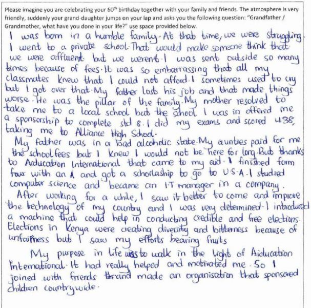 Er möchte gerne Informatiker werden und den Gebrauch von Technologie in Kenia fördern. Mark hat die Volksschule unter den 1%-Besten seines Jahrgangs abgeschlossen.