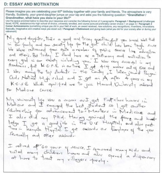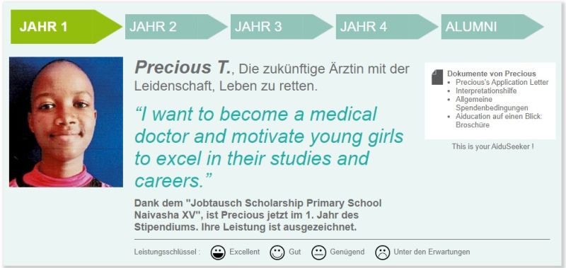 Sie möchte Ärztin werden. Wenn sich ihr die Möglichkeit bietet, würde sie sogar gerne in den Vereinigten Staaten studieren und eine Ausbildung machen und dann auch in Kenia arbeiten. Außerdem möchte sie eine Krankenstation in ihrer Gemeinde eröffnen, um die Dorfbewohner kostenlos zu behandeln.