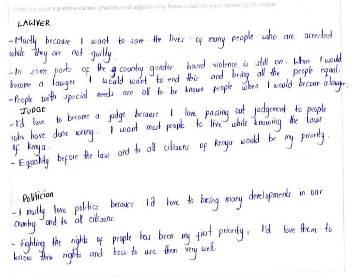 Sie möchte Anwältin werden und sich für die Rechte von Menschen einsetzen, die in der Gesellschaft in der Minderheit sind, wie z. B. Behinderte. Außerdem möchte sie eine Organisation gründen, die ihrer Gemeinde mit verschiedenen Projekten wie Bohrlöchern, Bildung und Landwirtschaft hilft.